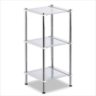 16783 The Contas Collection Three Tiered Shelf provides a stylish way to organize your bathroom. Three sturdy, tempered glass shelves have two frosted trimmed sides on a sleek frame with a chrome finish. The perfect way to store bathroom essentials and decorations. Features: -Three tier shelf. -Contas collection. -Sturdy, tempered glass shelves with two frosted trimmed sides. -Chrome finished frame. -Three shelves. -Store bathroom essentials and decorations. -Ships knocked down, ready to assemble. -Overall dimensions: 29.88'' H x 13.75'' W x 13.75'' D.